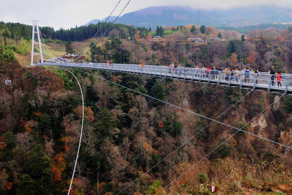 Tại đây, quý khách sẽ được thưởng thức toàn cảnh mùa xuân tuyệt đẹp của Nhật Bản trên chiếc cầu khổng lồ dành cho người đi bộ “Kokonoe Yume Suspension”. Cầu được khánh thành vào năm 2006, trở thành một trong những điểm du lịch đặc sắc của vùng Kyushu, dài 390m, rộng 1.5m và độ cao 173m. Từ độ cao này, quý khách có thể ngắm toàn cảnh thiên nhiên hùng vĩ nơi đây: Thác Shindou – nằm trong top “100 thác nước đẹp nhất Nhật Bản, đèo Narukogawa. Và đặt biệt hơn nữa, bạn sẽ được sẽ được ngắm nhìn thung lũng nhuộm một màu hoa xuân rực rỡ.