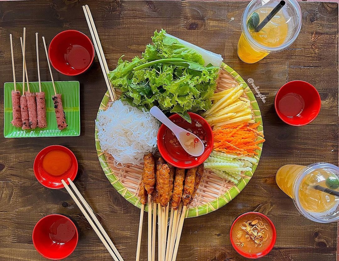 Nem nướng thơm ngon, đẫm vị có màu vàng. Ăn nem nướng kèm theo bánh hỏi, rau thơm, các loại nguyên liệu khác như: dưa leo, khế, chuối chát,… Những thành phần vô cùng đơn giản, thân thuộc nhưng khi chấm kèm chén tương xay đặc sệt, càng ăn càng thấy thơm ngon khó cưỡng.