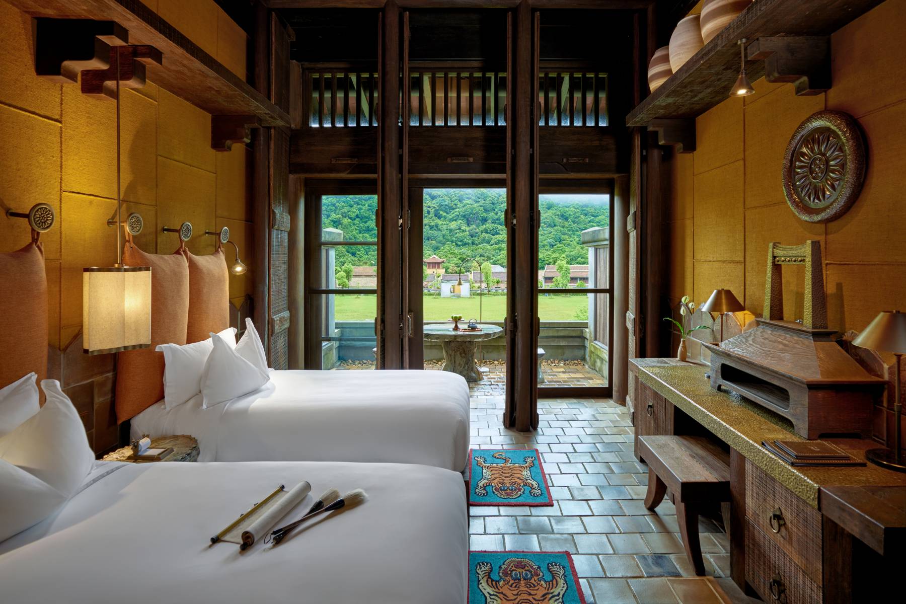 Không gian nghỉ dưỡng thấm đẫm hồn Việt với các chất liệu được chăm chút từ vỏ bao bố làm bằng sợi đay, tường trấu, cửa gỗ then cài và sàn nhà làm từ loại gốm địa phương. Cảm nhận sự thư giãn với bồn tắm đồng hay tận hưởng vẻ đẹp thiên nhiên lan tỏa qua từng ô cửa kính.