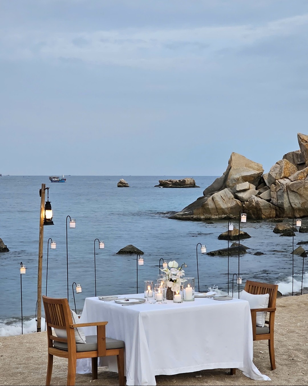 Trở về Amanoi, bạn có thể đặt bữa tối riêng trong phòng nghỉ, nơi ánh đèn vàng dịu dàng hòa vào tiếng sóng. Hoặc cũng có thể chọn dịch vụ BBQ riêng tại sân biệt thự. Đầu bếp sẽ đến chuẩn bị và phục vụ bữa ăn theo yêu cầu, giúp bạn thư giãn và thưởng thức ẩm thực trong không gian riêng của mình.