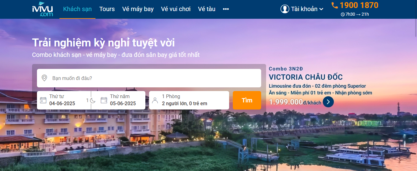 iVIVU.com tự hào là nền tảng du lịch trực tuyến hàng đầu tại Việt Nam. Với thông điệp “Đặt du lịch – Đặt với iVIVU.com”. Nền tảng này đã không ngừng phát triển và xây dựng một hệ sinh thái dịch vụ du lịch toàn diện. Bao gồm combo du lịch, đặt phòng khách sạn, tour du lịch, vé máy bay, vé tàu hỏa, vé vui chơi giải trí. Và các dịch vụ bổ trợ khác như vé xe, bảo hiểm du lịch,…