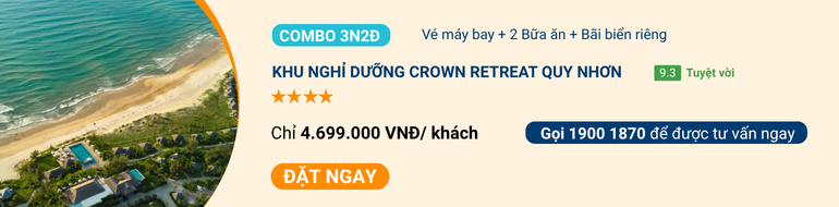 Những ngày hè ươm nắng của bạn sẽ càng thêm rực rỡ với một trong những resort Quy Nhơn cao cấp 2025 là Crown Retreat Quy Nhơn. Resort nằm trên cung đường biển xanh ngát, bờ cát trắng phau trải dài. Có lối thiết kế mang đậm nét sang trọng và hiện đại của miền biển châu Âu. Bờ biển riêng tư đưa du khách tận hưởng không khí thoáng đãng bên thiên nhiên nguyên sơ.