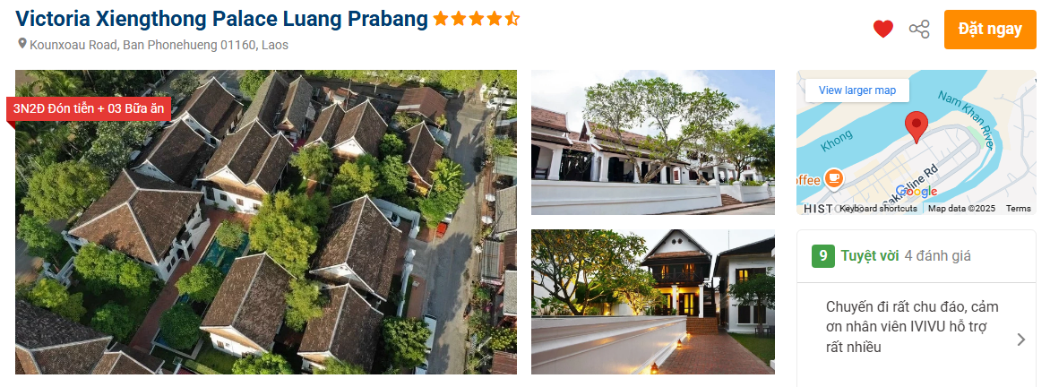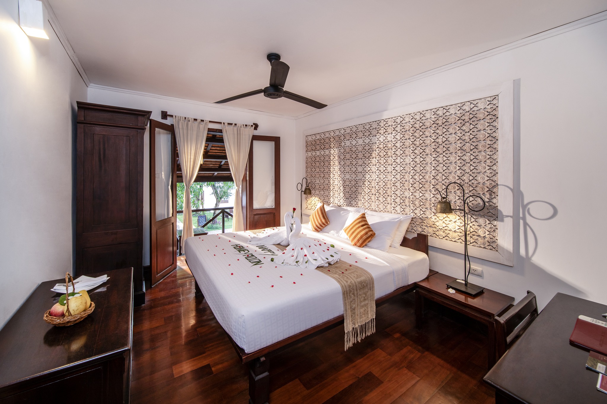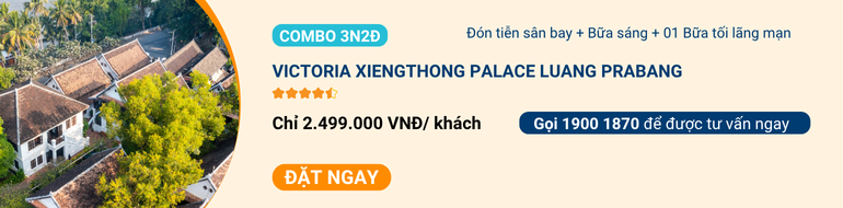 Nếu muốn trải nghiệm sang trọng và vị trí đắc địa, Victoria Xiengthong Palace Luang Prabang là lựa chọn xuất sắc. Khách sạn nằm ngay cạnh chùa Wat Xiengthong – biểu tượng văn hóa Luang Prabang, với tầm nhìn hướng ra sông Mekong. Phòng ốc rộng rãi, trang nhã, có điều hòa, TV, minibar và phòng tắm riêng. Vị trí thuận tiện: cách chùa Wat Pak Khan và bảo tàng Heritage House 2 phút đi bộ, cách sân bay chỉ 5,6 km.