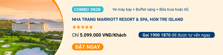 Combo nghỉ dưỡng ven biển tiếp theo trong danh sách bạn có thể tham khảo là Nha Trang Marriott Resort & Spa, Hon Tre Island. Nơi đây tọa lạc tại vị trí riêng biệt và nép bên bờ biển xinh đẹp bậc nhất đảo hòn Tre. Khu nghỉ mang đến sự sang trọng và quyến rũ cho kỳ nghỉ của bạn.