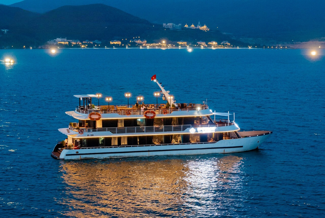 Một trải nghiệm sang trọng và lãng mạn không thể bỏ qua chính là du thuyền đêm. Các du thuyền như Emperor Cruise hay Sea Coral Cruise thường phục vụ buffet hải sản, rượu vang, kèm theo âm nhạc nhẹ nhàng. Khi tàu lướt trên mặt nước, du khách sẽ được chiêm ngưỡng vịnh Nha Trang lung linh ánh đèn.