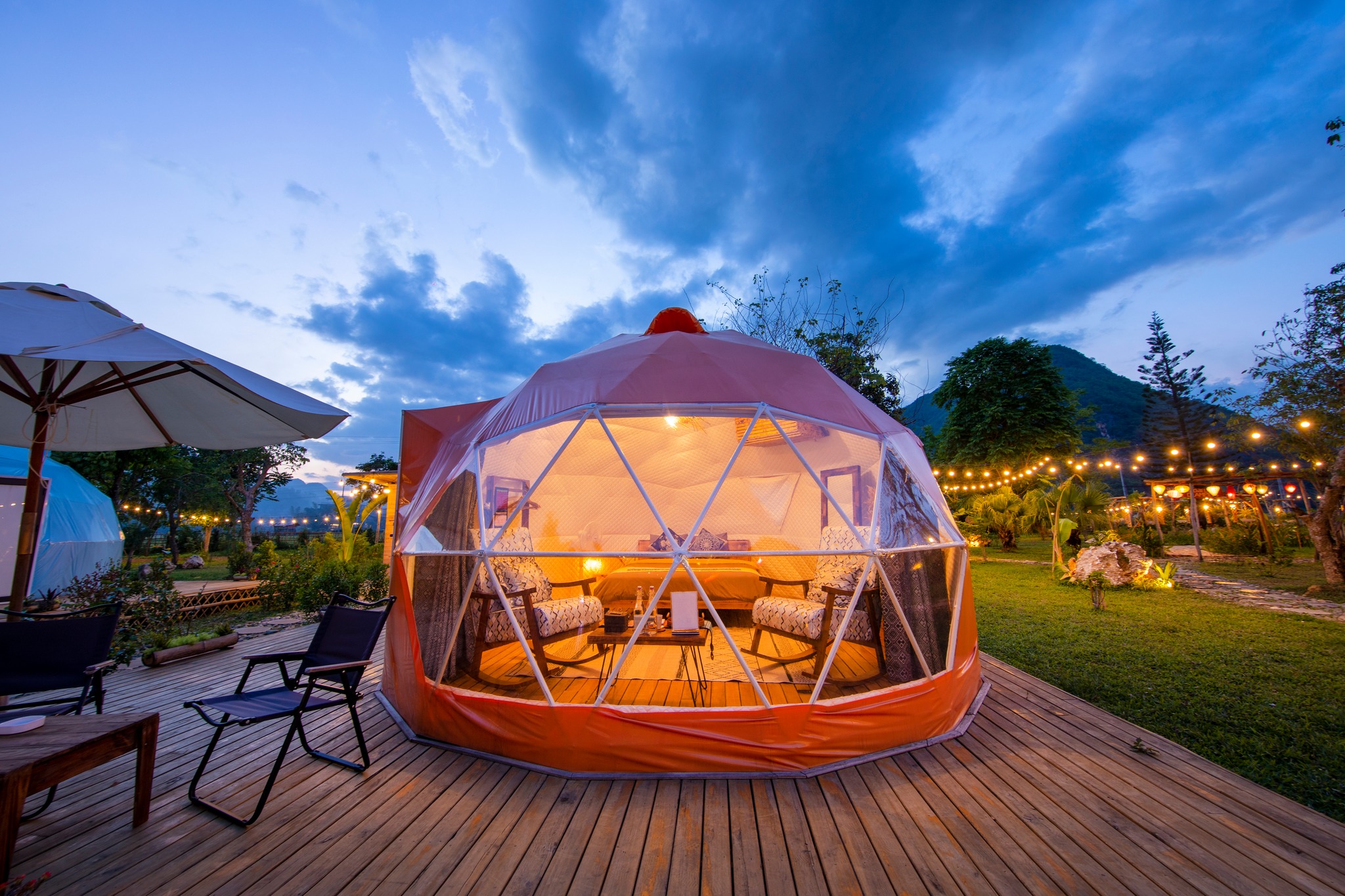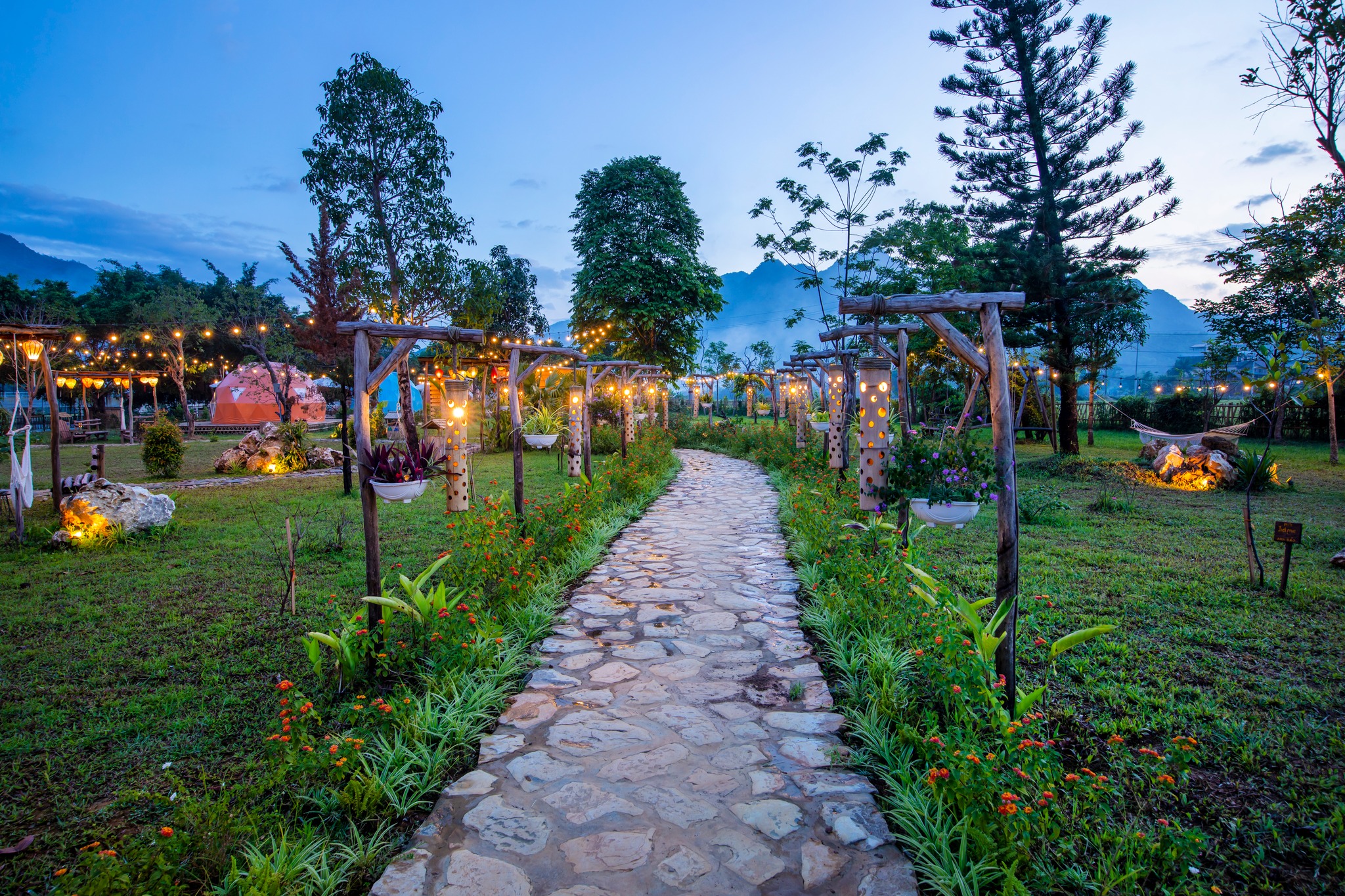 Bước vào khu glamping của Mai Châu Lodge Hòa Bình, bạn như lạc vào một khu vườn cổ tích – nơi cỏ cây, ánh đèn và không gian yên tĩnh kết hợp hoàn hảo. Con đường đá uốn lượn giữa những tán cây xanh mát dẫn bạn đến những căn lều mái vòm sang trọng, đầy đủ tiện nghi như điều hòa, giường êm, khu nghỉ thư giãn riêng và view thiên nhiên mở rộng tầm mắt.