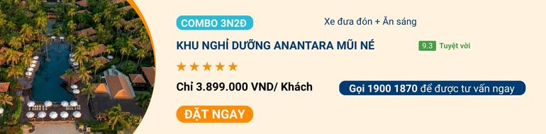 Anantara Mũi Né là khu nghỉ dưỡng 5 sao nổi tiếng, được thiết kế đậm chất Á Đông với mái ngói đỏ, hồ sen và không gian nội thất sang trọng. Resort sở hữu các villa có hồ bơi riêng, thích hợp cho kỳ nghỉ lãng mạn hoặc du lịch cao cấp.