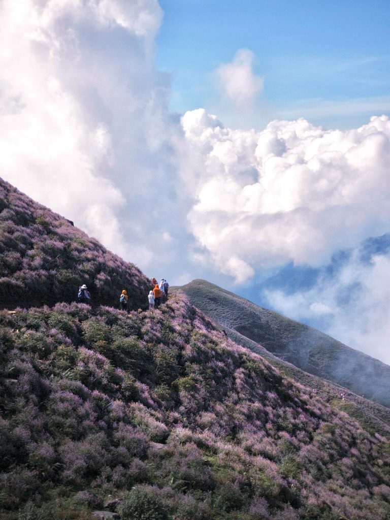 Càng lên cao, mây càng dày, gió càng mạnh, nhưng đổi lại, du khách được thưởng ngoạn biển mây lượn sóng ngay dưới chân. Giữa hành trình, những vạt chi pâu bắt đầu xuất hiện, tím dần từ lưng chừng núi cho đến đỉnh.