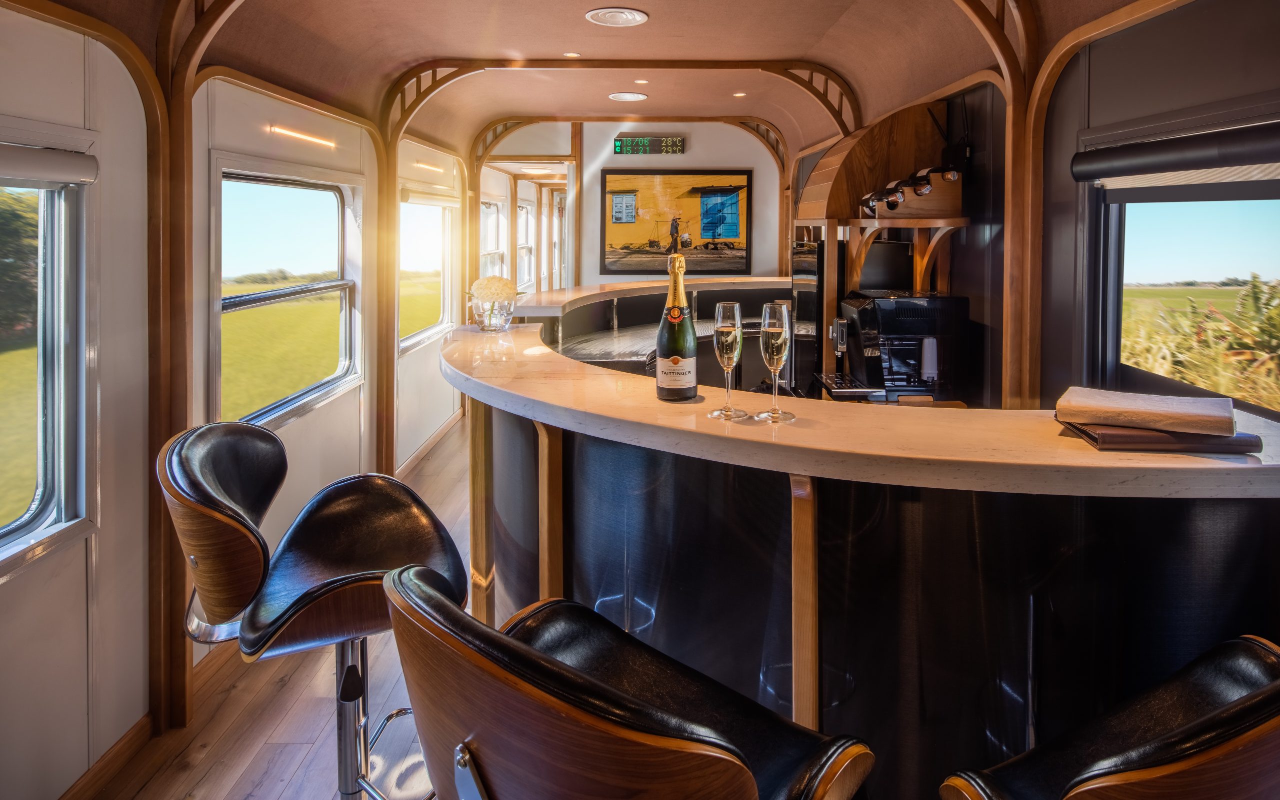 Lấy cảm hứng từ vẻ đẹp Việt Nam và phong cách du lịch đường sắt cổ điển, The Vietage by Anantara gây ấn tượng với sáu khoang riêng tư thiết kế tinh xảo. Mỗi khoang gồm hai ghế ngồi êm ái hướng cửa sổ. Mang đến cho du khách khung cảnh đồng lúa xanh mướt, núi non hùng vĩ và bờ biển óng ánh.