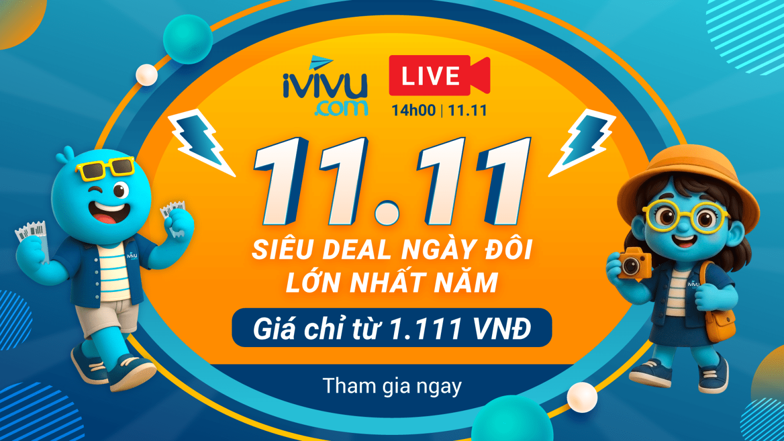 Đặc biệt, đừng bỏ lỡ livestream lúc 14h00, thứ ba ngày 11/11/2025 trên fanpage iVIVU.com. Hàng loạt ưu đãi du lịch chỉ từ 1.111 VNĐ sẽ được công bố trực tiếp. Bạn cũng có thể tham gia mini game và nhận quà tặng giới hạn dành cho khách hàng may mắn.