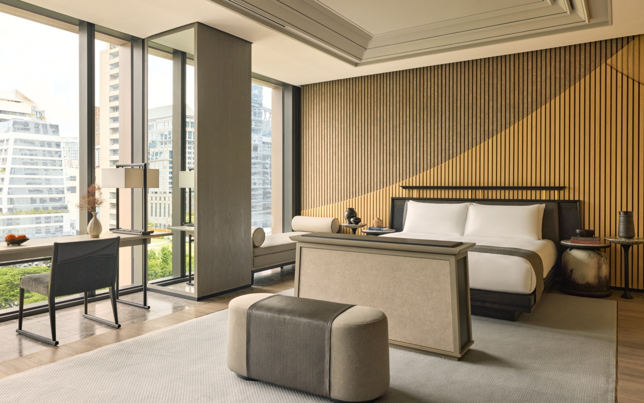 Nội thất phòng được thiết kế tinh giản nhưng tinh xảo. Tông màu be, gỗ tự nhiên, đá sáng, cùng những đường cong mềm mại tạo cảm giác thư giãn. Phòng tắm rộng rãi với bồn tắm lớn, buồng tắm đứng, vòi sen mưa. Một số hạng phòng đặc biệt còn có phòng chiếu phim cá nhân, phòng trị liệu spa riêng hoặc khu vực tiếp khách.