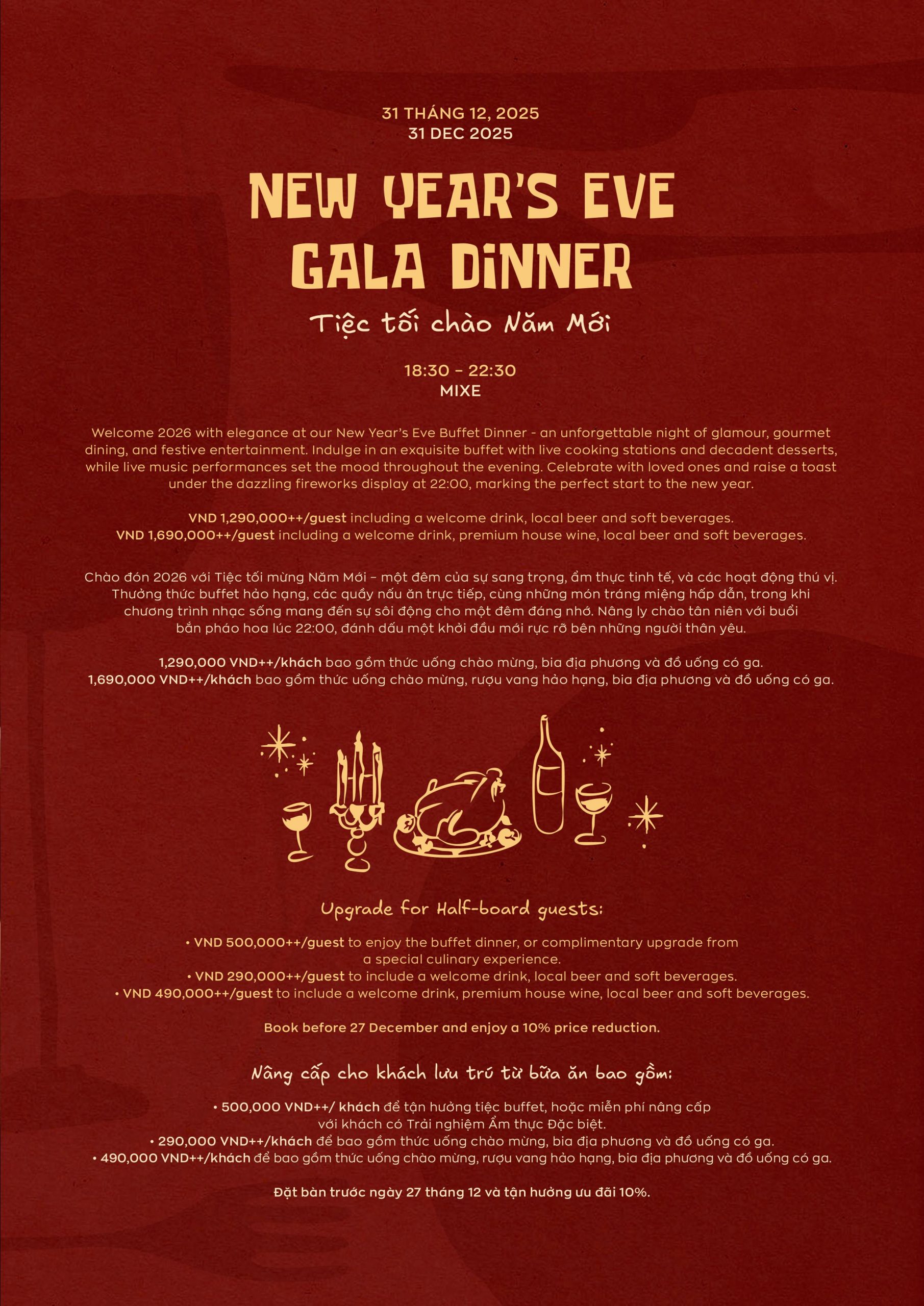 Chào đón 2026 với tiệc tối mừng Năm Mới sang trọng và đáng nhớ. Nơi mang đến trải nghiệm ẩm thực tinh tế và các hoạt động thú vị. Bạn được thưởng thức buffet hảo hạng và những món tráng miệng hấp dẫn. Đặc biệt, cùng nâng ly chào tân niên, chiêm ngưỡng màn bắn pháo hoa rực rỡ trên bầu trời đêm lúc 22:00. Sự kiện đánh dấu khởi đầu năm mới hứng khởi bên những người thân yêu.