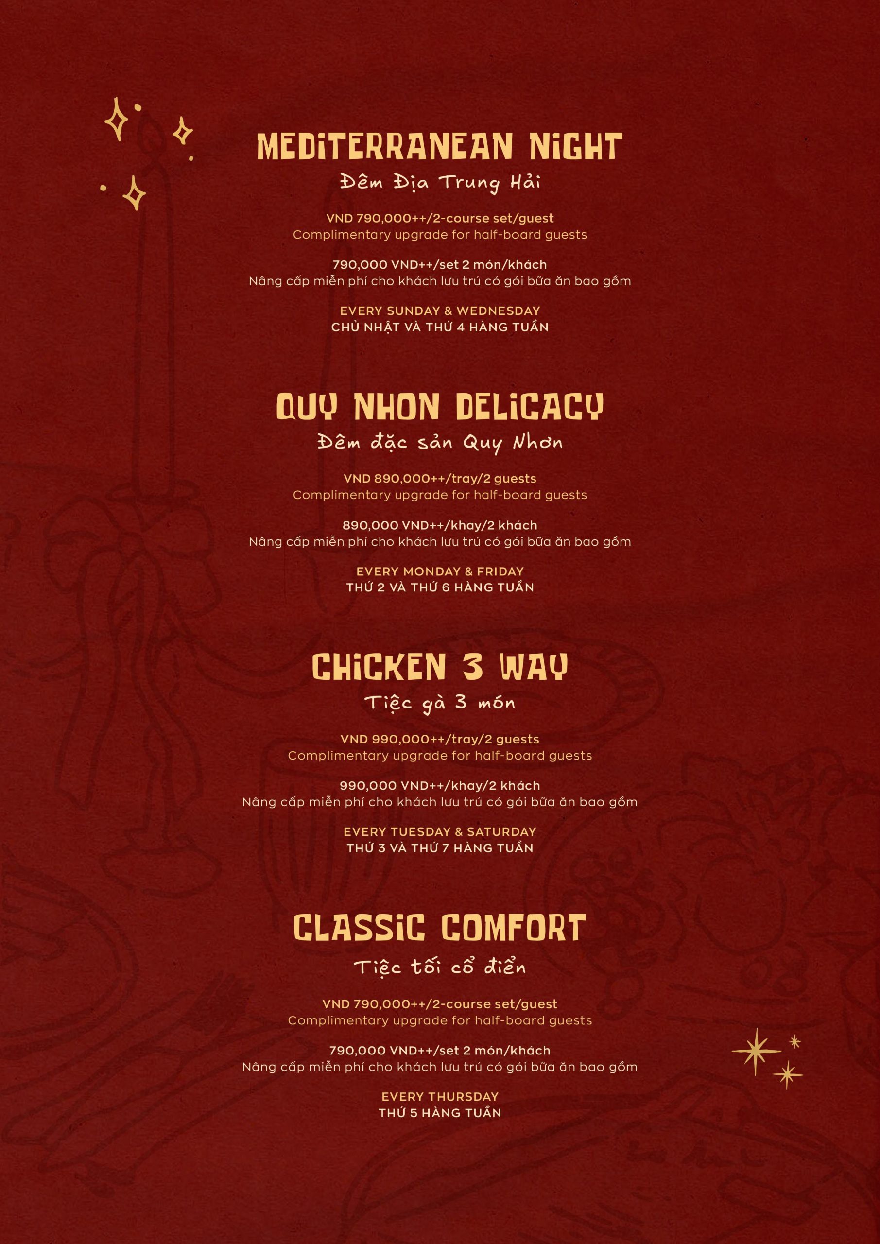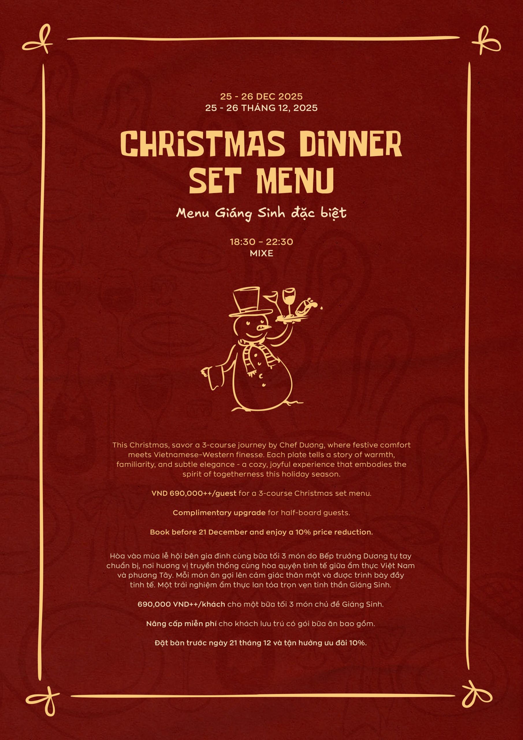 Hòa vào mùa lễ hội bên gia đình cùng bữa tối 3 món do Bếp trưởng Dương tự tay chuẩn bị. Thực đơn được thiết kế đặc biệt, nơi hương vị truyền thống cùng hòa quyện tinh tế giữa ẩm thực Việt Nam và phương Tây. Mỗi món ăn gợi lên cảm giác thân mật và được trình bày đầy tinh tế. Trải nghiệm ẩm thực mang đến không khí Giáng Sinh trọn vẹn.