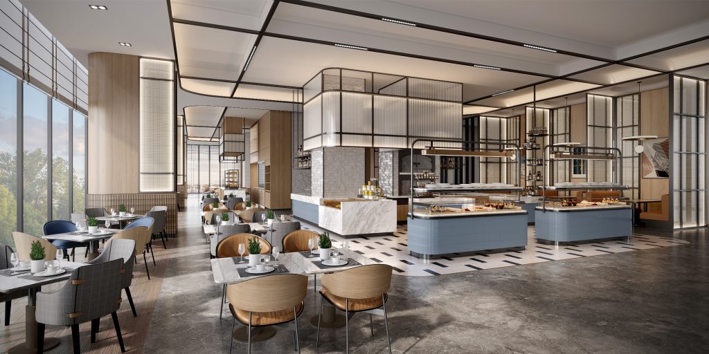 Ẩm thực và giao lưu kết nối là một phần quan trọng trong trải nghiệm tại đây. Khách sạn mang đến nhiều không gian khác nhau, phục vụ đa dạng nhu cầu. Hệ sinh thái ẩm thực mang triết lý “Eat – Meet – Gather”, mở ra những không gian để thưởng thức, trò chuyện và kết nối.