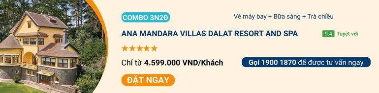Ana Mandara Villas Dalat Resort and Spa gồm các biệt thự cổ được xây dựng từ thời Pháp, nằm giữa rừng thông rộng lớn. Mỗi biệt thự mang kiến trúc cổ điển, được phục dựng cẩn thận và trang bị tiện nghi cao cấp. Khu resort nổi bật với dịch vụ cá nhân hóa, spa thư giãn, không gian yên tĩnh tuyệt đối.