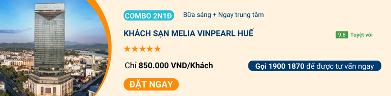 Khách sạn Melia Vinpearl Huế nằm tại trung tâm cố đô, hướng sông Hương và tựa núi Ngự với thiết kế 33 tầng sang trọng. Khách sạn sở hữu phòng nghỉ tiện nghi, hệ thống gym, spa, bể bơi hiện đại và phòng hội nghị 600m2. Skybar tầng 16 là nơi ngắm toàn cảnh Huế tuyệt đẹp, mang đến trải nghiệm Tết đầy thi vị.