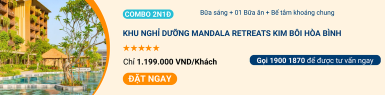 Mandala Retreats Kim Bôi Hòa Bình tọa lạc giữa vùng đất xứ Mường yên ả. Khu nghỉ dưỡng nổi bật với thiết kế gần gũi thiên nhiên, mang đến không gian thư thái giữa núi non. Điểm đặc biệt tại đây là hệ thống khoáng nóng Kim Bôi được dẫn trực tiếp đến từng phòng nghỉ. Mang đến trải nghiệm thư giãn riêng tư và tiện nghi. Hòa mình trong dòng nước khoáng ấm áp, hãy cảm nhận trọn vẹn sự an nhiên và cân bằng từ sâu bên trong.