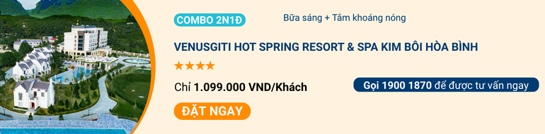 Venusgiti Hot Spring Resort & Spa Kim Bôi mang đến trải nghiệm nghỉ dưỡng khoáng nóng độc đáo. Nơi có dòng khoáng nóng Giếng Tiên có tuổi đời hàng trăm triệu năm được gìn giữ trọn vẹn sự tinh khiết và giá trị tự nhiên. Điểm nhấn của khu nghỉ là khu tắm khoáng nóng phong cách La Mã – Thermae Bath. Du khách có thể thả lỏng cơ thể, phục hồi năng lượng và chăm sóc sức khỏe trong không gian sang trọng. Venusgiti là lựa chọn lý tưởng để tận hưởng kỳ nghỉ thư giãn sâu. Thích hợp cho những chuyến đi ngắn ngày từ Hà Nội.