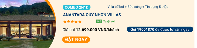 Combo 2N1Đ bao gồm villa bể bơi, bữa sáng và tín dụng dịch vụ đến 5.000.000 VND. Với dịch vụ tinh tế, trải nghiệm cá nhân hóa bên khung cảnh thiên nhiên nguyên sơ, nơi đây xứng đáng là biểu tượng của resort sang trọng Quy Nhơn cho kỳ nghỉ cao cấp.