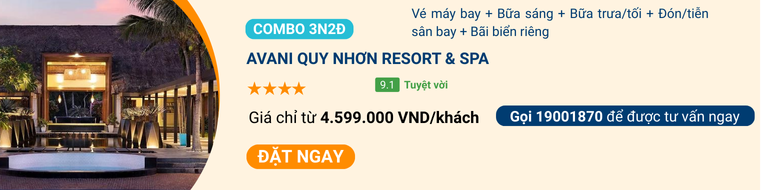 Combo 3N2Đ tại đây đã bao gồm vé máy bay, bữa sáng, bữa trưa hoặc tối và đưa đón sân bay. Với không gian thân thiện cho gia đình, tiện nghi hiện đại và dịch vụ tinh tế, Avani Quy Nhơn Resort giúp du khách tận hưởng trọn vẹn kỳ nghỉ thư thái bên bờ biển.