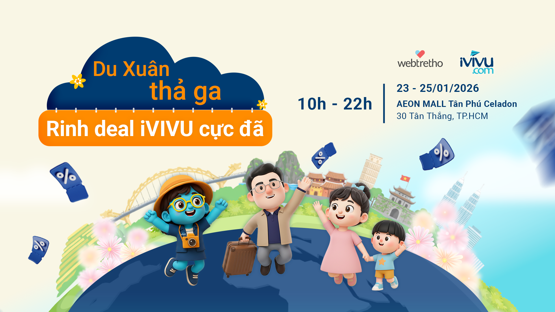 iVIVU.com sẽ chính thức góp mặt tại sự kiện Webtretho Family Fair 5 – Aeon Mall Tân Phú Celadon, ngày hội gia đình quy mô lớn do Webtretho tổ chức. Chương trình quy tụ đông đảo khách tham quan cùng chuỗi hoạt động trải nghiệm, mua sắm và nhận quà diễn ra xuyên suốt 3 ngày liên tục.