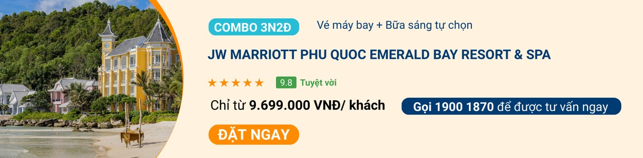JW Marriott Phu Quoc Emerald Bay Resort & Spa nổi bật với kiến trúc lấy cảm hứng từ trường Đại học Lamarck. Khu nghỉ dưỡng tọa lạc tại Bãi Khem, nổi tiếng với vẻ đẹp tự nhiên. Combo bao gồm vé máy bay khứ hồi và 02 đêm nghỉ tại phòng Emerald Bay Garden View. Bữa sáng hơn 100 món được phục vụ tại nhà hàng Tempus Fugit hướng biển.