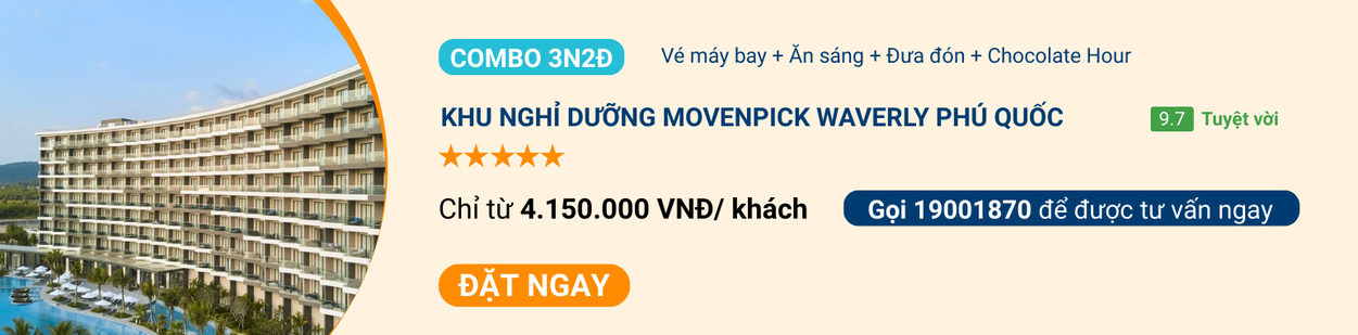 Khu nghỉ dưỡng Movenpick Waverly Phú Quốc mang phong cách hiện đại và thân thiện với gia đình. Combo bao gồm vé máy bay khứ hồi, đưa đón sân bay và 02 đêm nghỉ tại Studio King Room có ban công. Bữa sáng tự chọn theo tiêu chuẩn quốc tế được phục vụ hàng ngày.