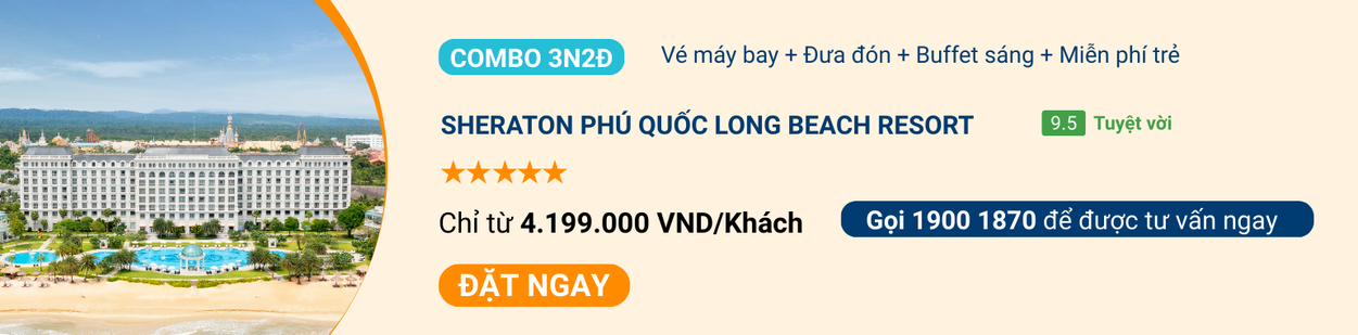 Sheraton Phú Quốc Long Beach Resort sở hữu không gian rộng rãi và thiết kế hài hòa với thiên nhiên. Combo bao gồm vé máy bay khứ hồi, đưa đón sân bay và 02 đêm nghỉ dưỡng. Buffet sáng kết hợp ẩm thực địa phương và quốc tế, phù hợp nhiều độ tuổi.