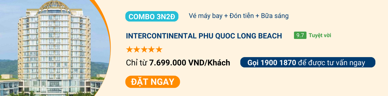 InterContinental Phu Quoc Long Beach nằm dọc bãi Trường, nổi bật với khung cảnh hoàng hôn đẹp. Khu nghỉ dưỡng mang phong cách sang trọng và dịch vụ chuẩn quốc tế. Combo bao gồm vé máy bay khứ hồi, đưa đón sân bay theo lịch trình khách hàng và 02 đêm nghỉ tại phòng Classic King Room. Bữa sáng tự chọn được phục vụ mỗi ngày với không gian thoáng đãng.
