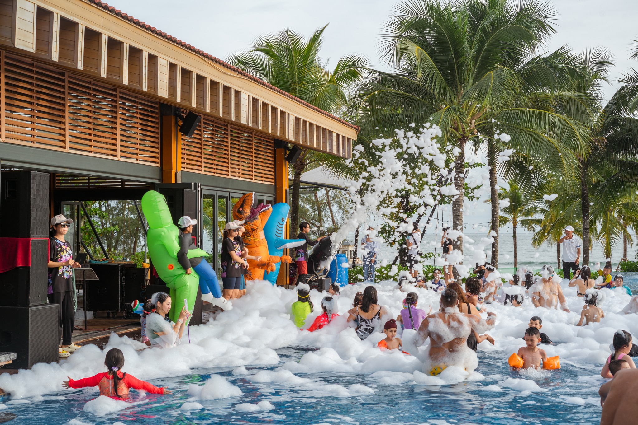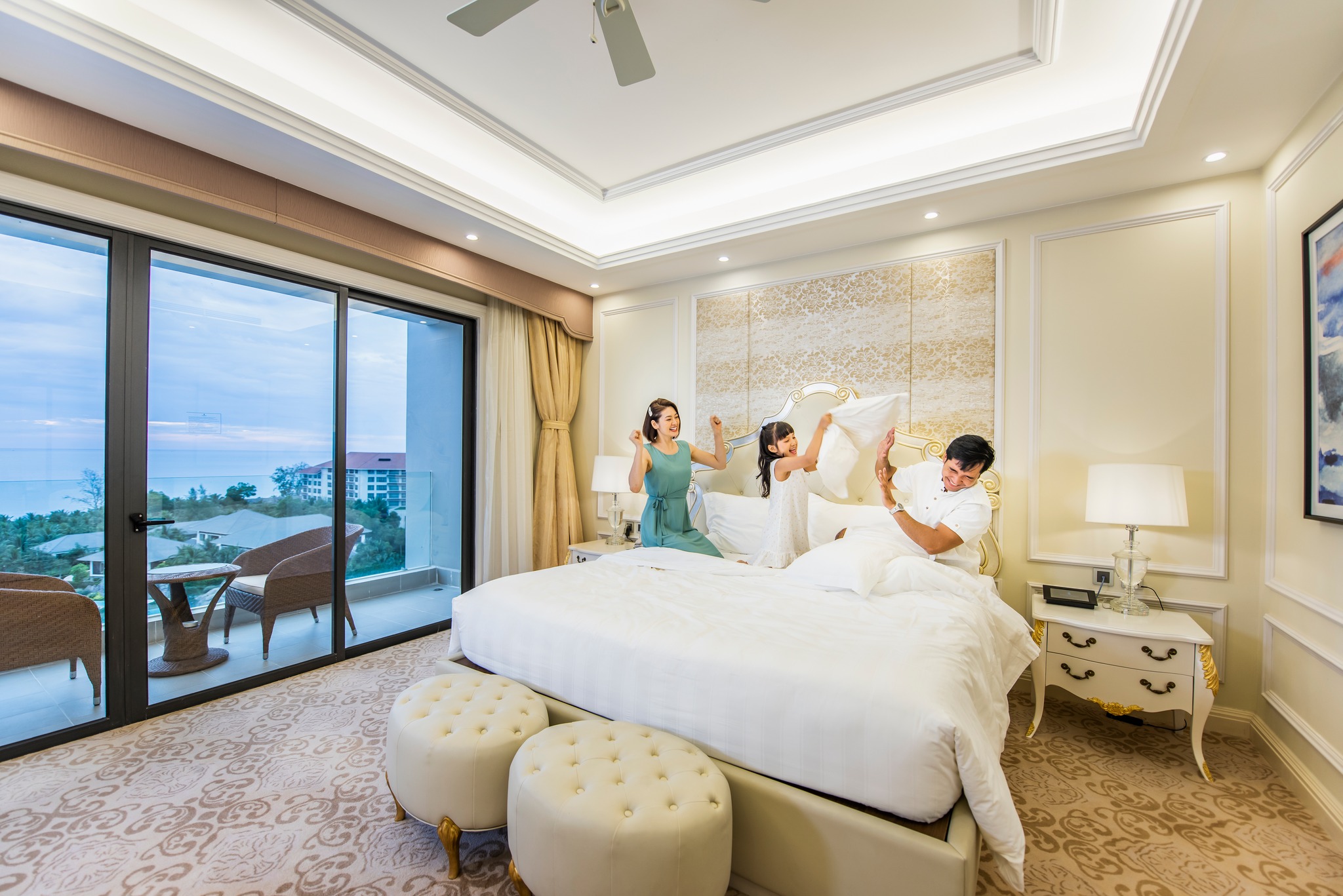Khu nghỉ dưỡng miễn phí phụ thu ăn sáng và ngủ chung cho hai trẻ em mỗi phòng. Gia đình có thể vui chơi tại bể bơi ngoài trời với các làn trượt nước. Foam Party diễn ra vào chiều thứ bảy hàng tuần mang đến trải nghiệm sôi động. Ngoài ra, khách sạn còn có bãi biển riêng, VinBus đến Grand World, khu vui chơi trẻ em, phòng gym và wifi tốc độ cao. Đây là lựa chọn phù hợp cho du khách tìm kiếm combo Phú Quốc dành cho gia đình.