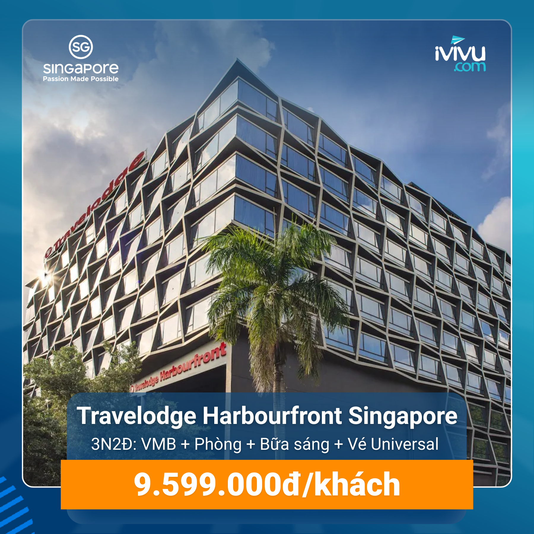 Travelodge Harbourfront Singapore là khách sạn 4 sao hiện đại, tọa lạc đối diện VivoCity và gần ga MRT HarbourFront. Vị trí lý tưởng để vui chơi Sentosa và Universal Studios. Không gian trẻ trung, tiện nghi, phù hợp cho kỳ nghỉ năng động tại Singapore.