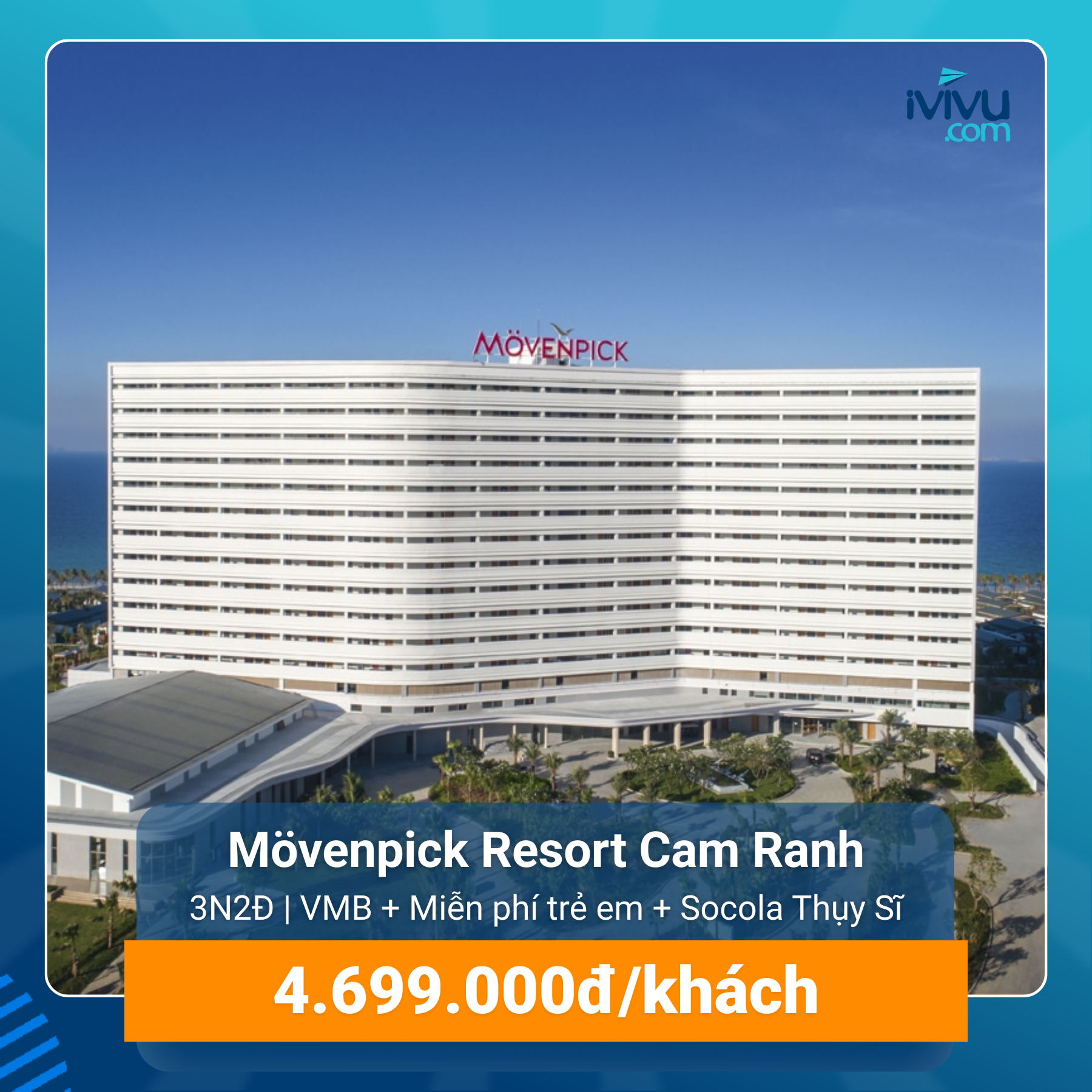 Mövenpick Resort Cam Ranh tọa lạc tại Bãi Dài, chỉ cách sân bay 10 phút di chuyển. Khu nghỉ dưỡng sở hữu không gian sang trọng, thiết kế tinh tế, tầm nhìn biển rộng mở, phù hợp cho kỳ nghỉ gia đình và nghỉ dưỡng cao cấp.
