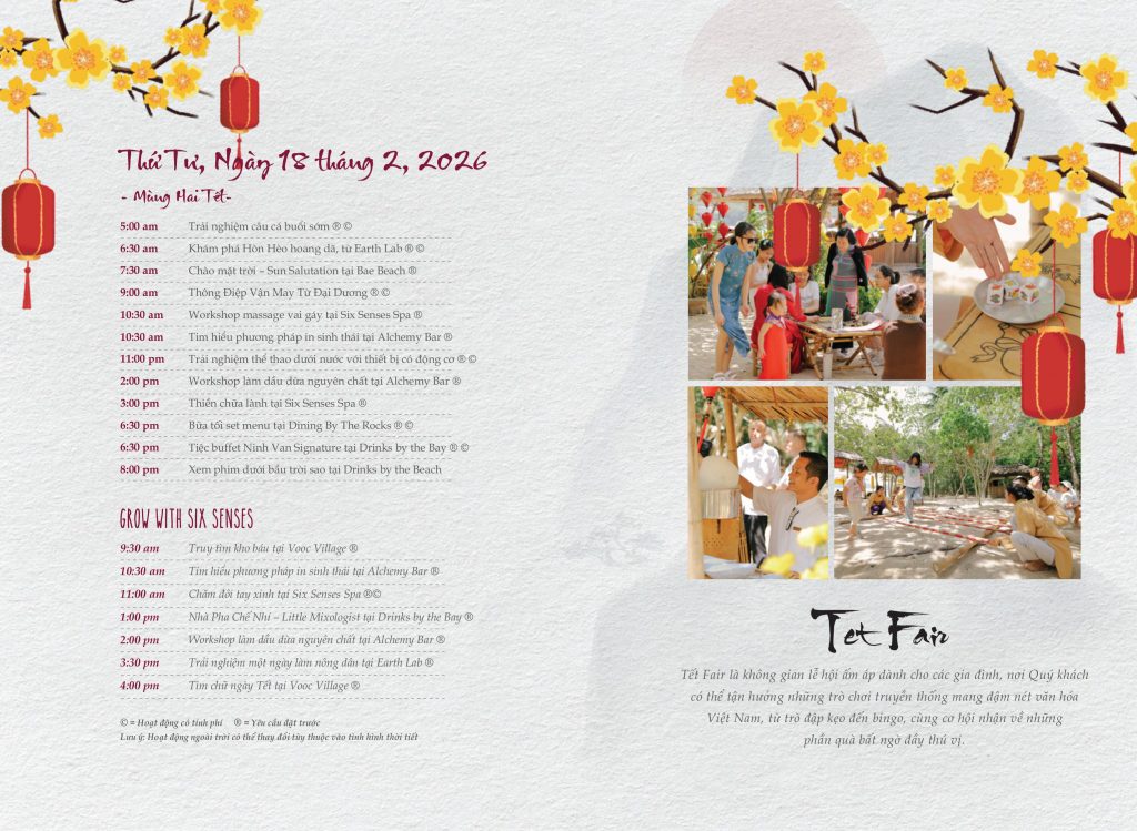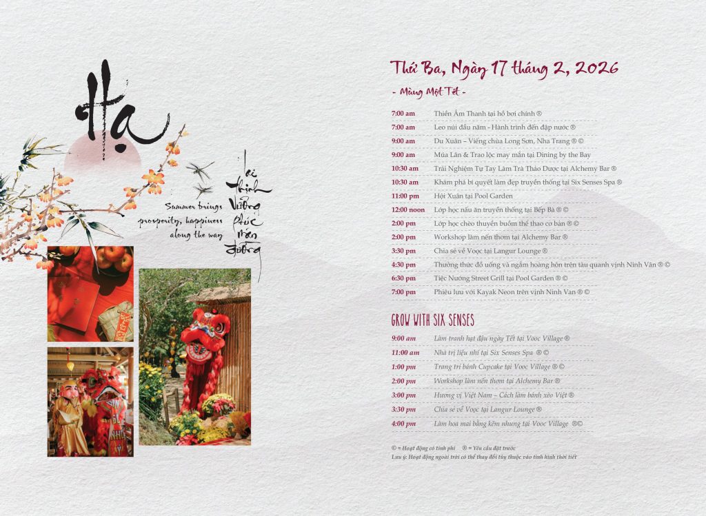 Trong không gian thiên nhiên tĩnh lặng, Tết tại Six Senses Ninh Vân Bay không còn là những tất bật thường ngày mà trở thành hành trình trải nghiệm văn hóa, sức khỏe và sự gắn kết gia đình. Xuyên suốt từ 28 tháng Chạp đến mùng 6 Tết, resort tổ chức chuỗi hoạt động phong phú tái hiện trọn vẹn tinh thần Tết Việt.