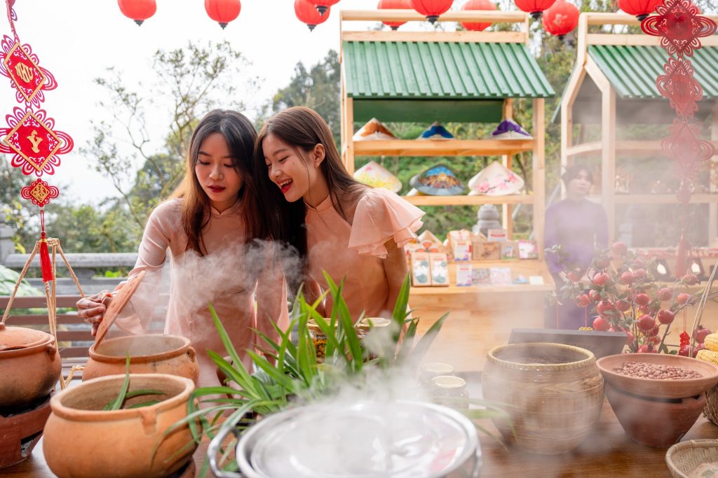 Không khí Tết cổ truyền được tái hiện xuyên suốt hành trình du xuân. Ngay từ chân núi, du khách đã được chào đón bằng không gian trang trí Tết rực rỡ và các hoạt động rước lân, triển lãm nghệ thuật lân sư rồng, vẽ mặt nạ truyền thống. Trên đỉnh núi, Vùng đất Nguồn Cội trở thành điểm dừng chân quen thuộc cho những ai muốn xin chữ Ông Đồ, gieo quẻ đầu năm…