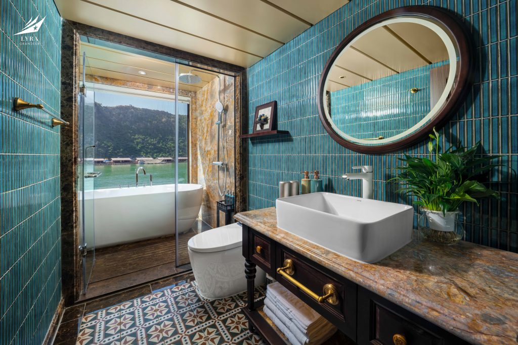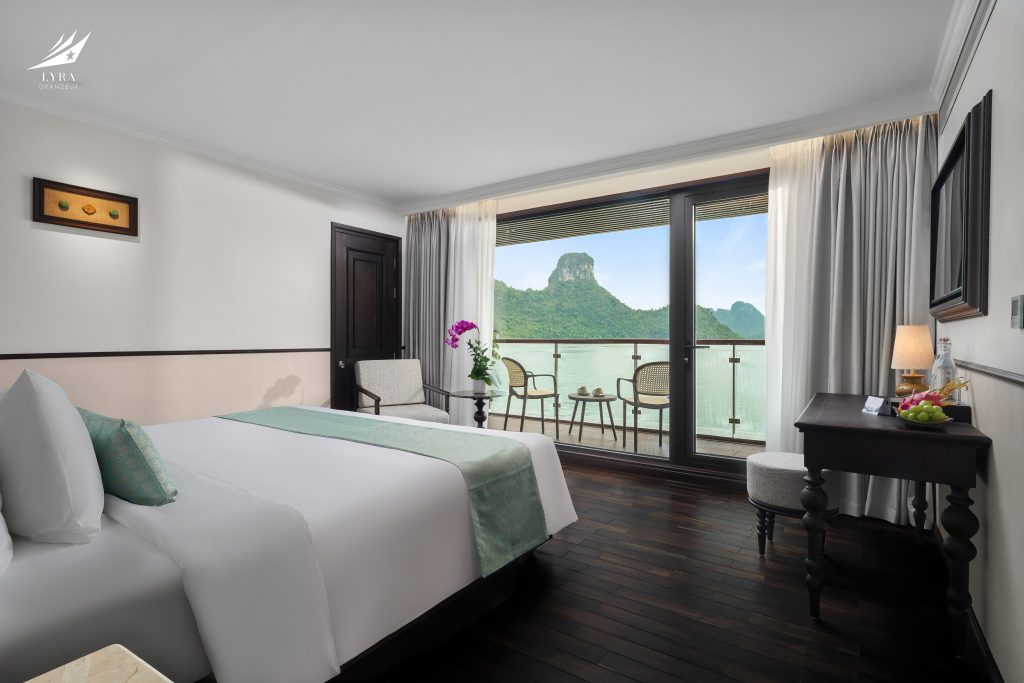 Với 33 phòng nghỉ mang phong cách Đông Dương, Lyra Grandeur mang đến không gian lưu trú vừa tinh tế vừa tiện nghi. Mỗi cabin đều được thiết kế với cửa sổ kính toàn cảnh, ban công riêng và bồn tắm hướng vịnh.