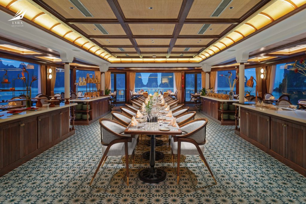 Du thuyền Lyra Grandeur gây ấn tượng với triết lý thiết kế “heritage-twisted”. Nơi các yếu tố văn hóa truyền thống Việt Nam được tái hiện trong một không gian kiến trúc hiện đại. Những chi tiết thủ công như khảm trai, sơn mài hay gốm nghệ thuật trở thành điểm nhấn thẩm mỹ.
