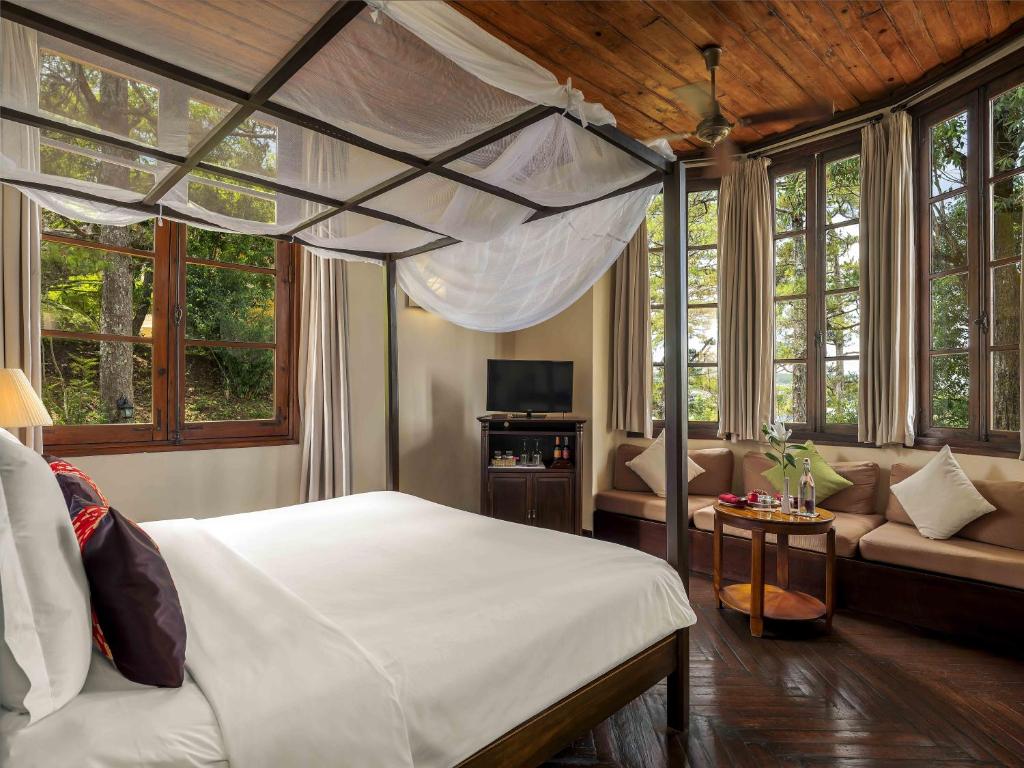 Ẩn mình giữa rừng thông xanh mát, khu nghỉ dưỡng gây ấn tượng với hệ thống biệt thự Pháp cổ có lịch sử lâu đời. Không gian nơi đây mang lại cảm giác riêng tư, nhẹ nhàng. Đặc biệt phù hợp cho các kỳ nghỉ dưỡng dài ngày hoặc các gói combo Đà Lạt 3N2Đ.