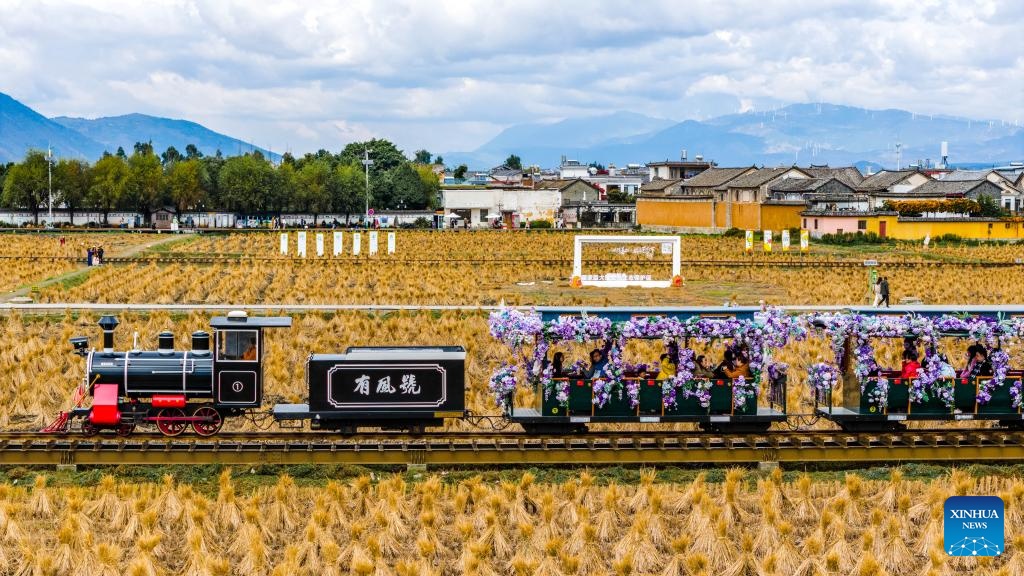 Một chuyến tàu tham quan đi qua Hỷ Châu cổ trấn.