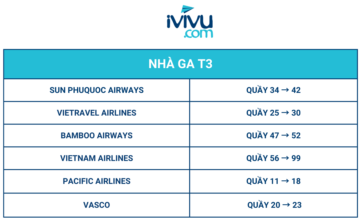 🏠Nhà ga T3: chuyến bay nội địa của: Vietnam Airlines, Pacific Airlines, VASCO, Bamboo Airways, Vietravel Airlines, Sun PhuQuoc Airways.