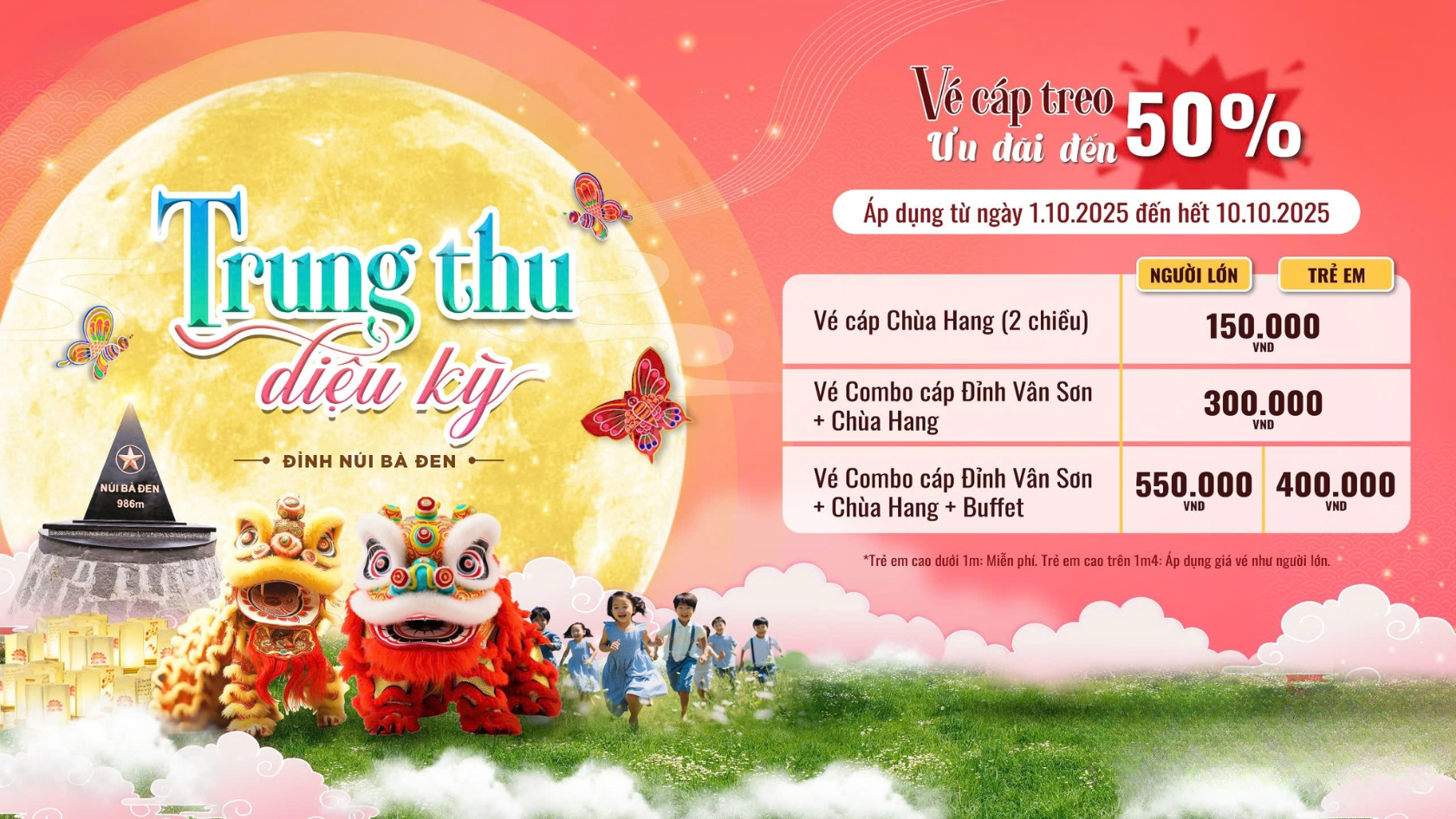 Nhân dịp Trung thu 2025, từ ngày 1/10 đến 10/10/2025, Sun World Bà Đen Tây Ninh gửi đến du khách chương trình ưu đãi 50% giá vé cáp treo như một lời tri ân ý nghĩa trong mùa đoàn viên. Đây cũng là thời điểm người dân và du khách đổ về Tây Ninh để tham dự lễ hội Yến Diêu Trì Cung và hành hương lên núi Bà. Ưu đãi đặc biệt này hứa hẹn sẽ khiến hành trình của bạn thêm trọn vẹn, ý nghĩa và khó quên.