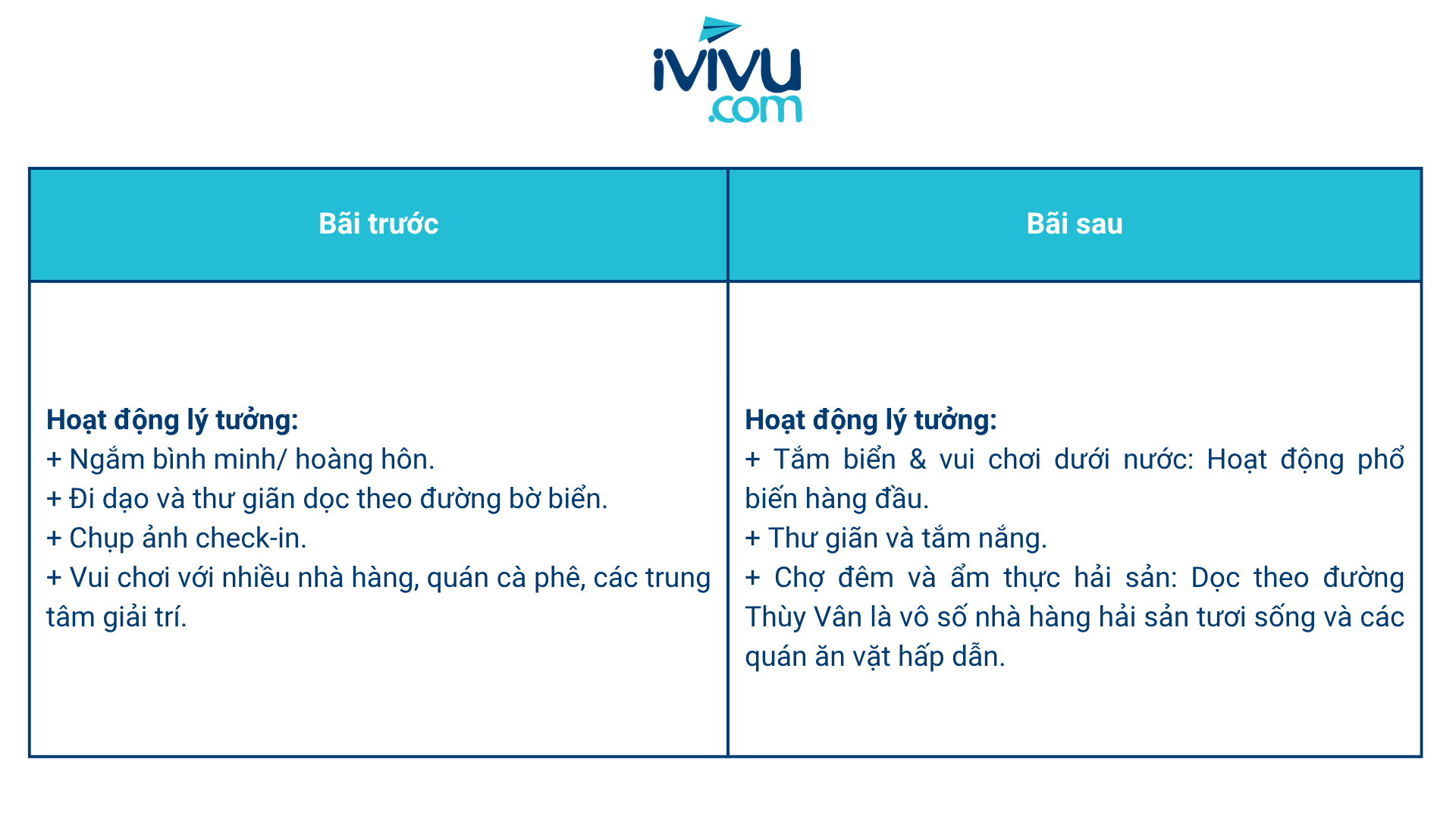 👉 Có thể chia lịch trình thành các điểm di chuyển theo khu vực: Bãi Sau – trung tâm; khu vực đường Trần Phú – Hải đăng; khu vực ngoại ô như Hồ Tràm – Phước Hải.