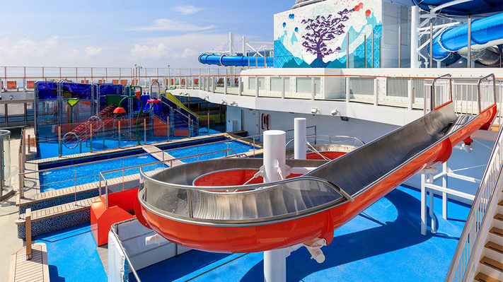 Công viên nước ngoài trời với hệ thống ống trượt nước đa dạng, uốn lượn quanh boong tàu với nhiều cấp độ từ nhẹ nhàng đến cảm giác mạnh.