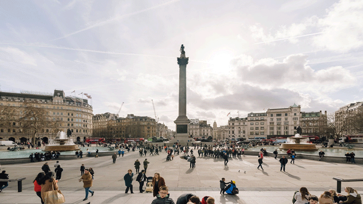 Quảng trường Trafalgar: Một di tích lịch sử lâu đời của nước Anh, rất cổ kính với tượng đài chúa Horatio Nelson, bên dưới là 4 chú sư tử khổng lồ cùng nhiều đài phun nước nhỏ bao quanh.