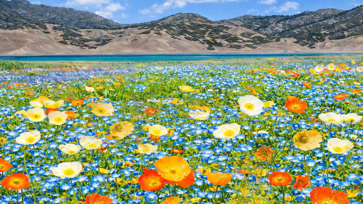Biển hoa Thiên Sơn nằm dưới chân dãy núi Thiên Sơn, khu thắng cảnh nổi bật với những cánh đồng hoa rực rỡ trải dài giữa thảo nguyên và núi tuyết, tạo nên khung cảnh thiên nhiên rộng lớn và đầy màu sắc.