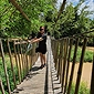 Sau đó, quý khách trãi nghiệm lên cầu treo đung đưa lắc lư, cầu treo sẽ đưa bạn đến khu tắm sông, ghềnh đá mát rượi. Hoặc thử sức với khu trò chơi dân gian, đi cầu thăng bằng, bắn nỏ.