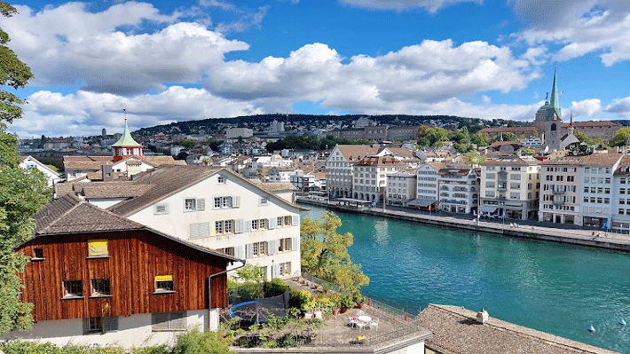 Đồi Lindenhof: Từ đây Quý khách có thể phóng tầm mắt qua phía bên kia của thành phố, ngăn cách bởi dòng sông Limmat xanh ngắt và cực kì trong.