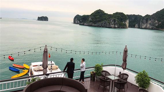 Uống trà, cà phê ngắm vẻ đẹp của vịnh Lan Hạ vào buổi sáng và thưởng thức bữa sáng nhẹ tự chọn.