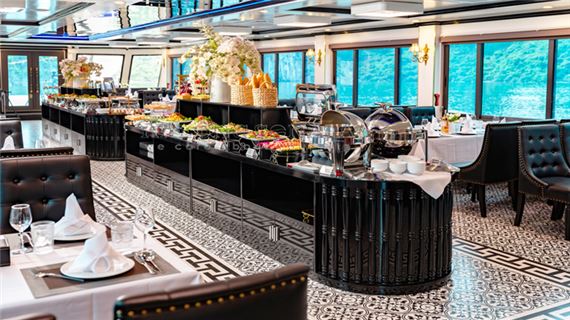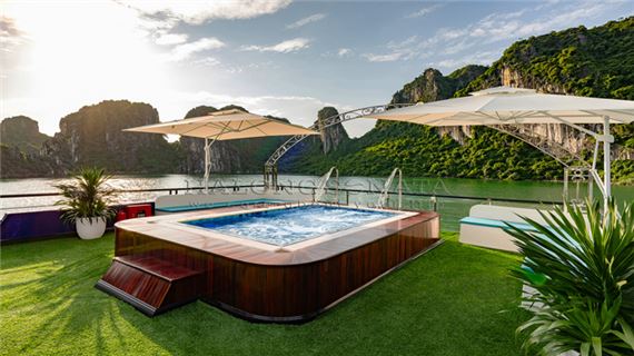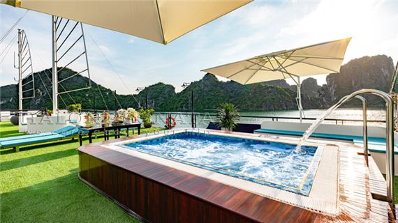 - Du thuyền 5 sao mới hạ thủy với 99 chỗ với 3 tầng phục vụ khách. Tầng 1 khu vực nhà hàng. Tầng 2 khu vực Luxury bar phục vụ khách thư giãn nghe nhạc. Tầng 3 khu vực ngắm vịnh, tắm nắng và ngâm bồn sục Jacuzzi.