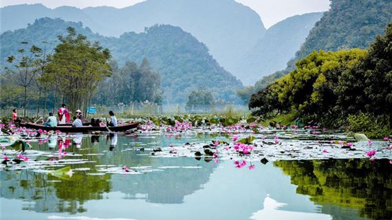 Ngồi thuyền trên suối Yến, ngắm cảnh non nước hữu tình.