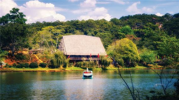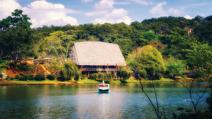 Buôn làng Ako Dhông, nét đẹp truyền thống với những ngôi nhà sàn bên hồ yên ả.